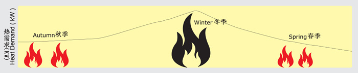 考慮到寒冷時(shí)供暖的要求,安裝在建筑物內(nèi)的鍋爐功率取決于熱負(fù)荷。而只有在冬季有限的時(shí)間段供暖需求大,因此裝機(jī)功率對(duì)平常供暖需求綽綽有余,這使鍋爐跨季時(shí)的平均性能相當(dāng)差。如果用于提供生活熱水,性能將更差。改善性能的方法是使用模塊組合熱源,按系統(tǒng)要求有效地提供熱源。